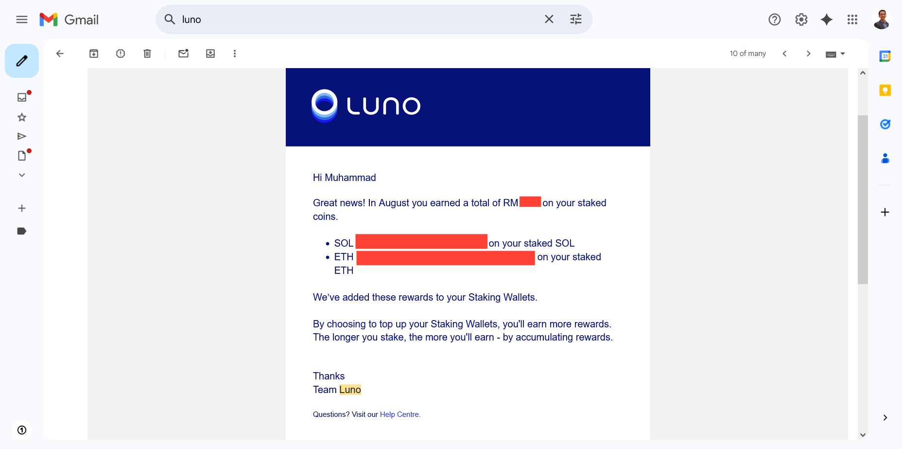 Dan setiap bulan korang akan dapat email report dari Luno berapa banyak rewards yang korang dapat untuk bulan tersebut. Atau korang boleh saja monitor daripada apps Luno ni bila-bila masa.