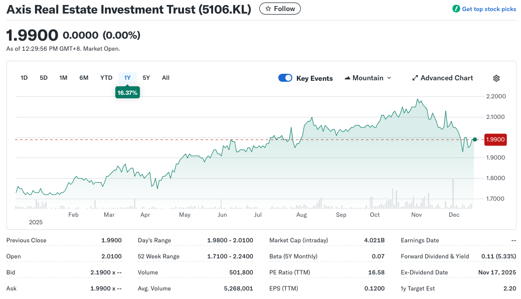 Sewaktu zaman Covid-19 (2021-2023), harga saham Axis sekitar dalam Rm1.40-RM1.50. Tetapi selepas pasca Covid-19, harganya naik hampir 26% kepada sekitar RM2.