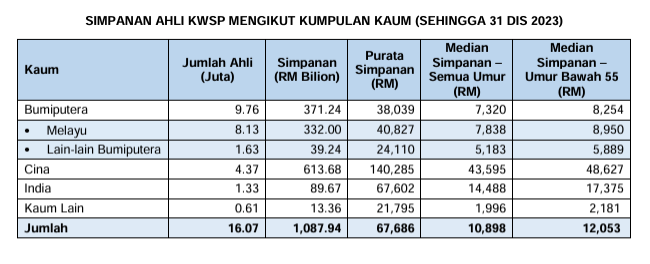 Beberapa minggu lepas, saya terjumpa statistik yang dikeluarkan oleh EPF tentang kadar simpanan pekerja di Malaysia bagi tahun 2023. Laporan tersebut bukan hanya menunjukkan pertumbuhan simpanan tahunan (2022-2023), tetapi paling menarik adalah jumlah simpanan mengikut kaum.