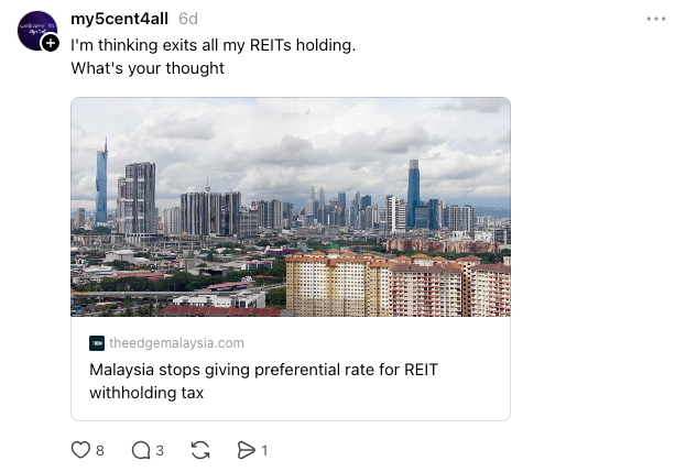 "Importantly, the tax revision does not affect REIT operations. Earnings are expected to remain supported by rental reversions and acquisitions, while payout ratios typically above 90% leave little room for operators to offset tax impacts through higher distributions." – The Edge Malaysia