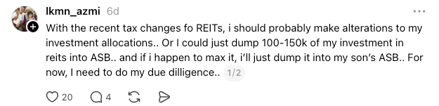 LHDN atau Kerajaan Malaysia baru saja mengumumkan perubahan cukai yang affect dividen REITs yang bakal pelabur-pelabur terima. Personally, perasaan saya bercampur-campur. Ada part yang risau. Apa part yang saya rasa masih lagi positif.
